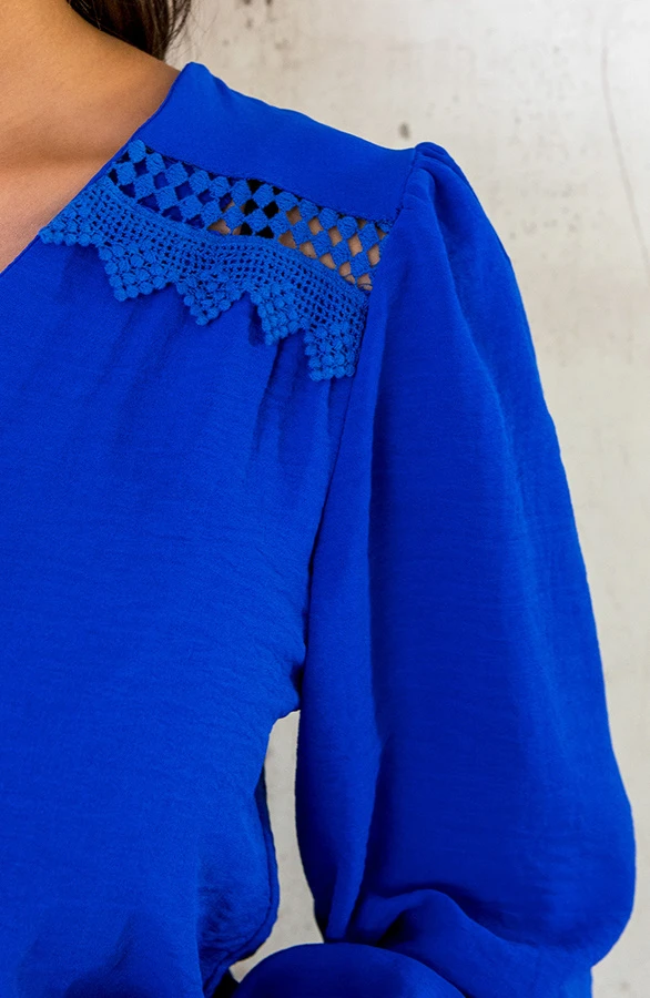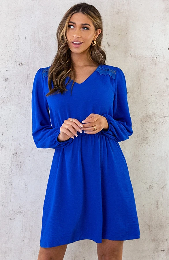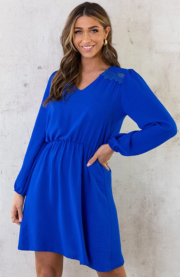 Product: Wauw! Hoe prachtig is deze jurk in het kobaltblauw?! De jurk is voorzien van een v-hals en heeft lange mouwen.