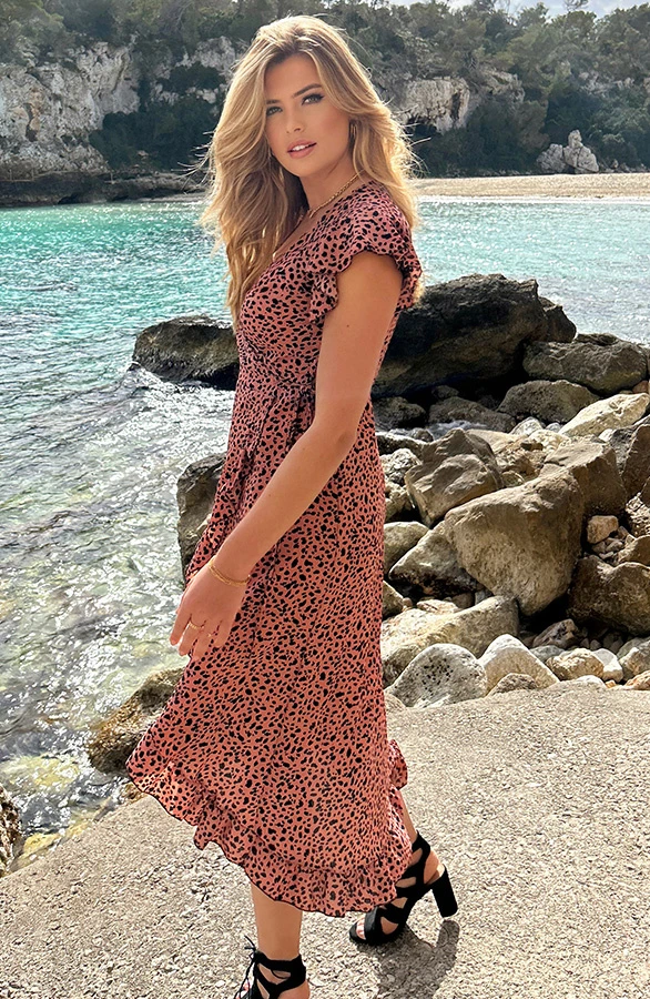 Product: Hou jij ook zo van dierenprint!? Dan is dit jurkje gegarandeerd een MATCH! Dit lange jurkje is voorzien van een overslag met ruches, een bijpassend lint in de taille en een vrolijke cheetahprint. Draag dit jurkje casual met sneakers of slippers, of ga voor de classy look met high heels!