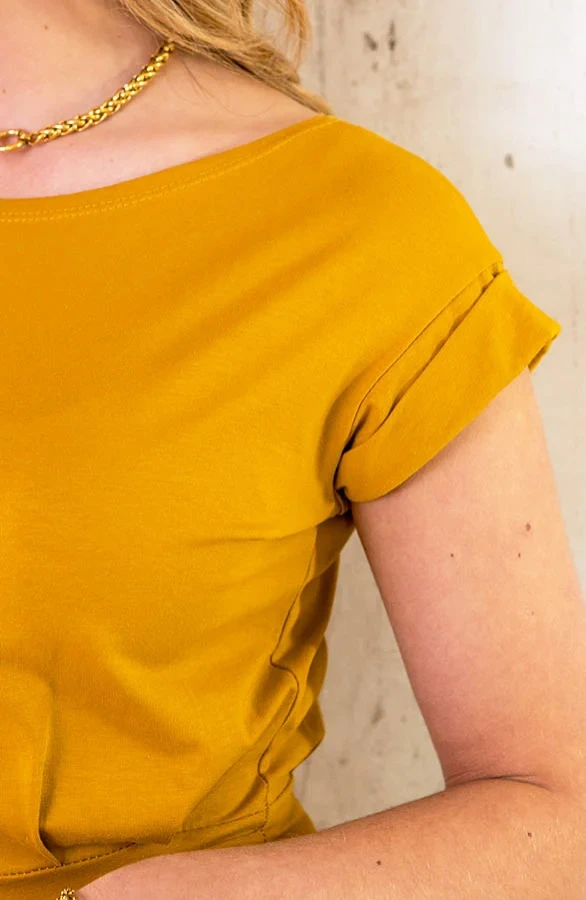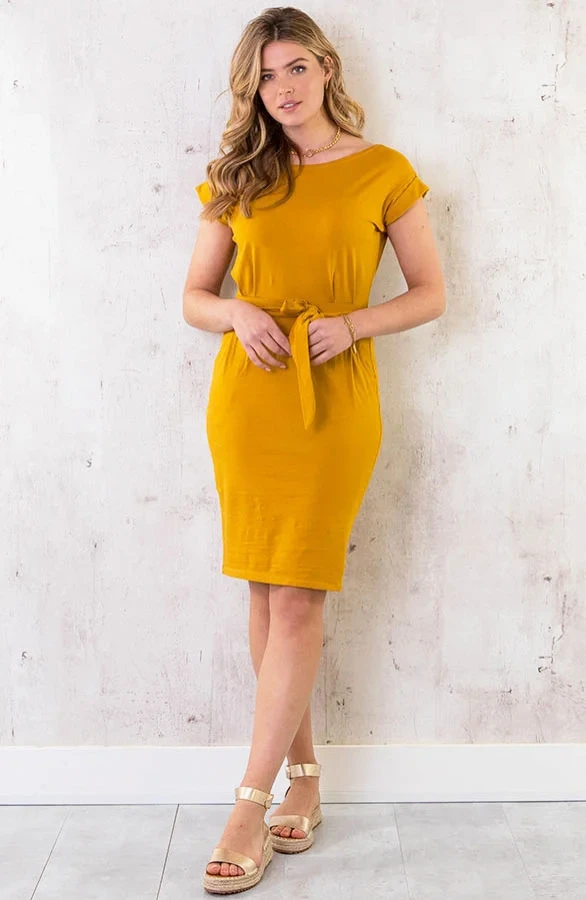 Product: Wij kunnen niet meer om de strikjurken heen. Al helemaal niet als de jurk voorzien is van de kleur okergeel. Wij zijn verliefd!
