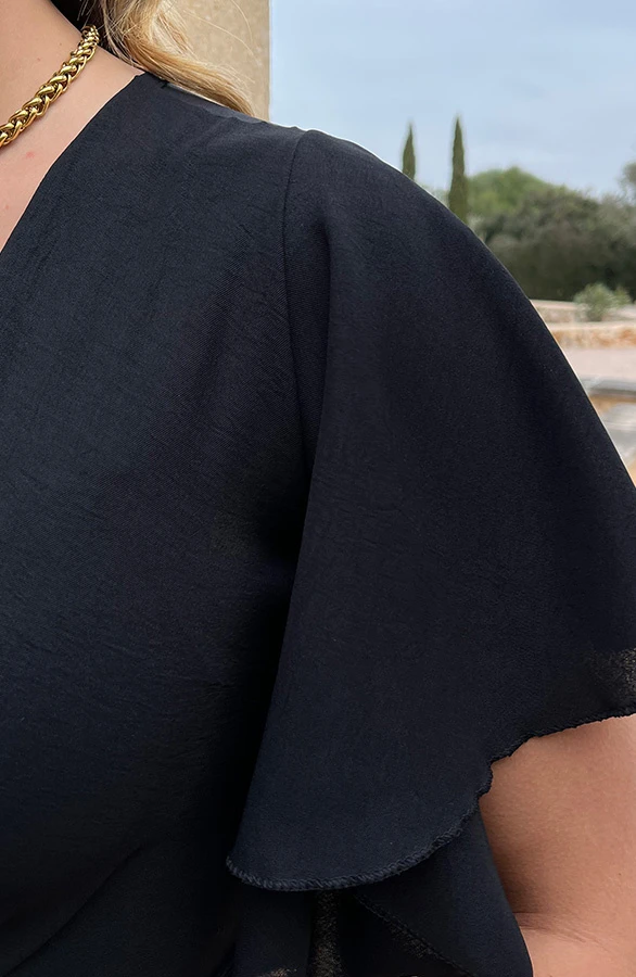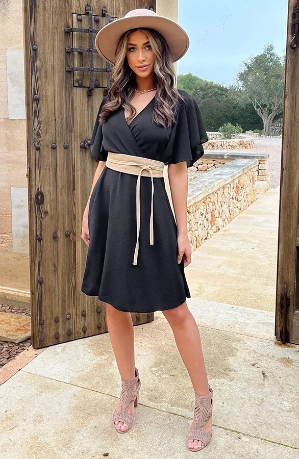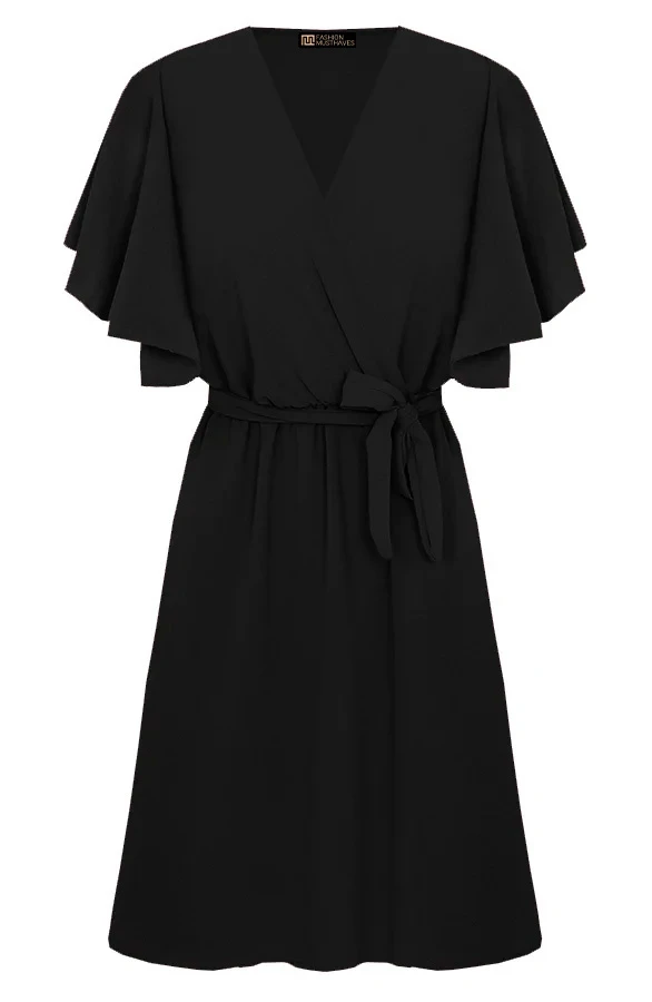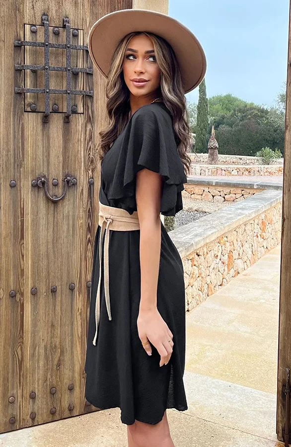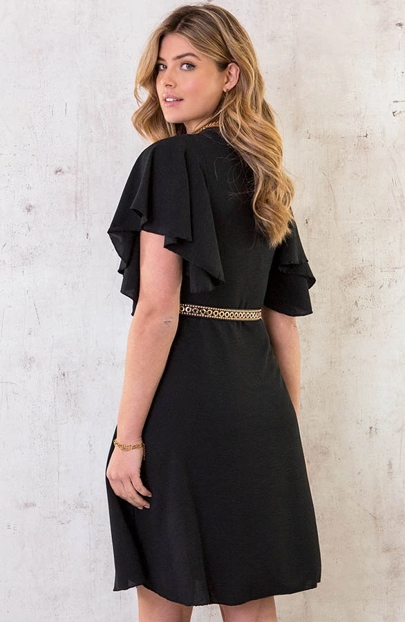 Product: Deze little black dress is onmisbaar in jouw garderobe! Het jurkje is voorzien van een v-hals, vleermuismouwen en een bijpassend lint om te strikken.