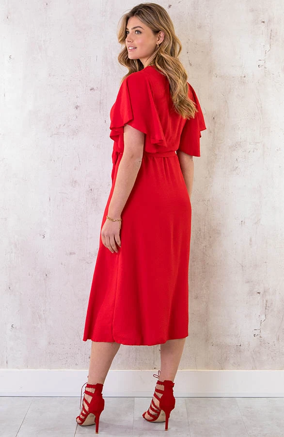 Product: Deze rode jurk is een aanwinst voor jouw jurken collectie! De jurk met vleermuismouwen is voorzien van een v-hals en elastiek in de taille. Het lint om te strikken maakt de jurk helemaal af!