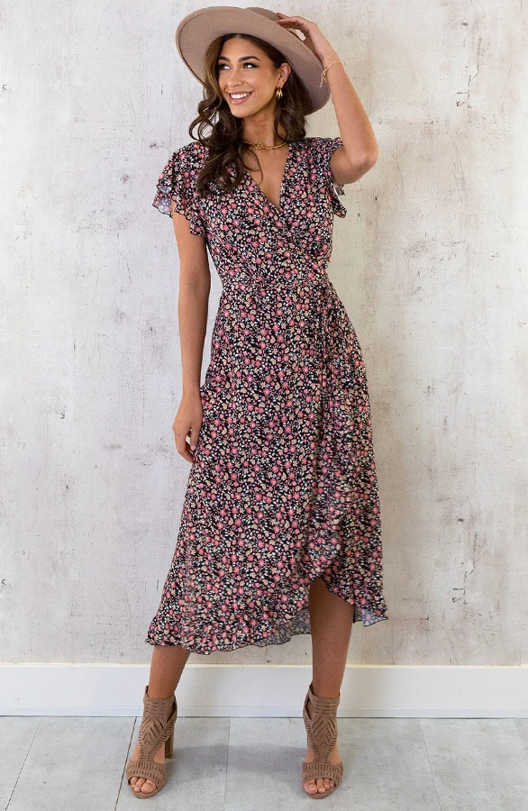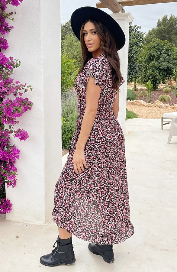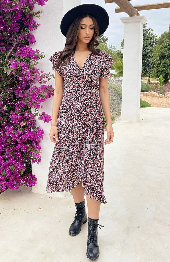 Product: Je kan nooit genoeg jurken hebben! Deze bloemenprint jurk is voorzien van een overslag en een lint om te strikken. Shop in meerdere prints!