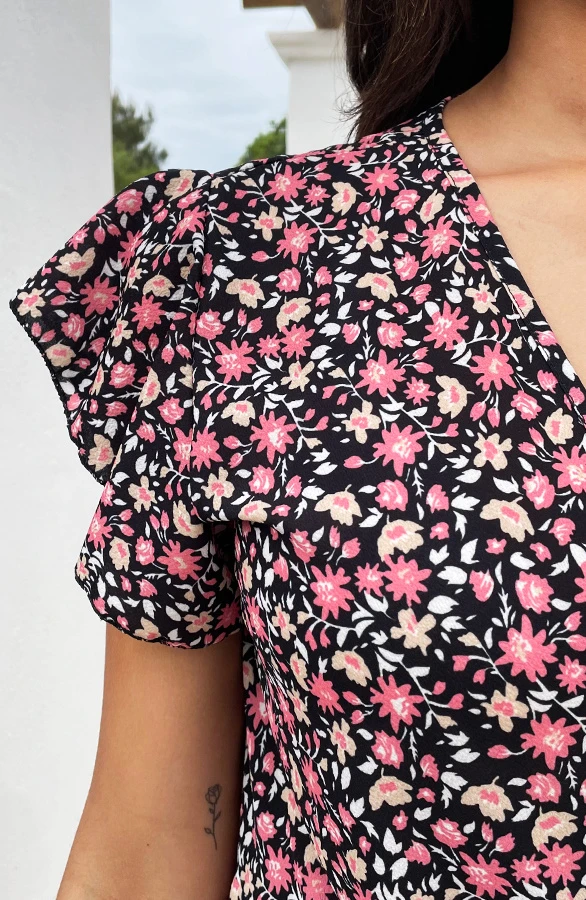 Details: v-hals, ruches, lint om te strikken, overslag en bloemenprint Materiaal: 100% Polyester