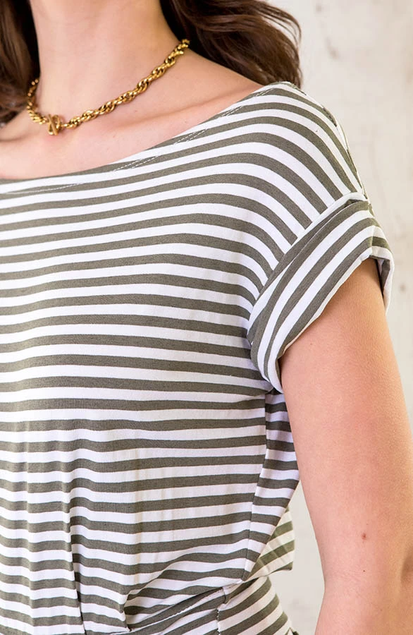 Details: ronde hals, korte mouwen, steekzakken en gestreept patroon Materialen: 95% Viscose, 5% Elastaan