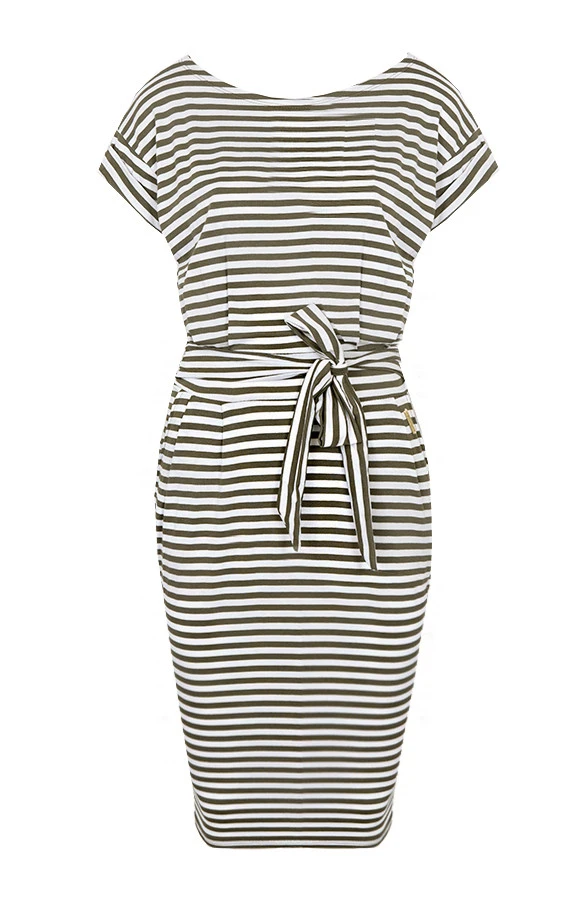 Product: Deze gestreepte strikjurk in groen/wit is voorzien van lussen om te strikken, heeft korte mouwen en een ronde hals. Oftewel: de perfecte jurk met strik voor het komende seizoen!