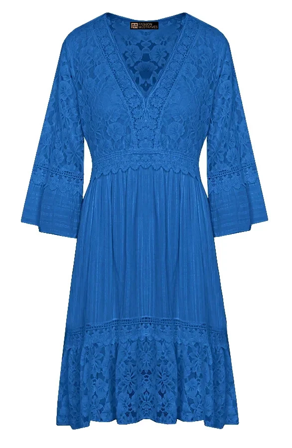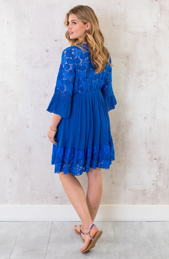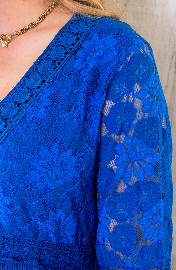 Product: Wauw! Hoe mooi is deze kanten jurk in het kobalt? Met deze jurk zijn alle ogen op jouw gericht! De jurk is voorzien van een v-hals, driekwart mouwen en een onderjurk.