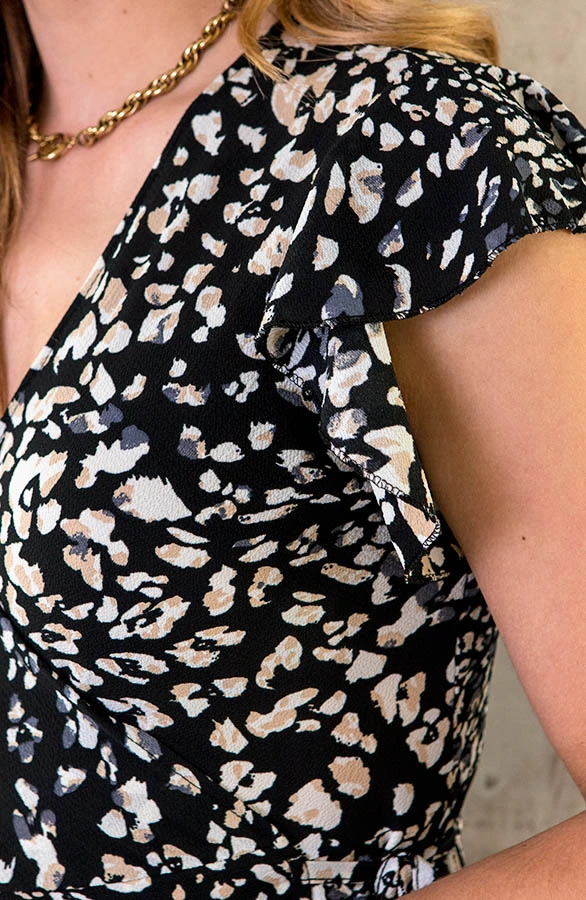 Details: v-hals, ruches, lint om te strikken, overslag en panterprint Materiaal: 100% Polyester