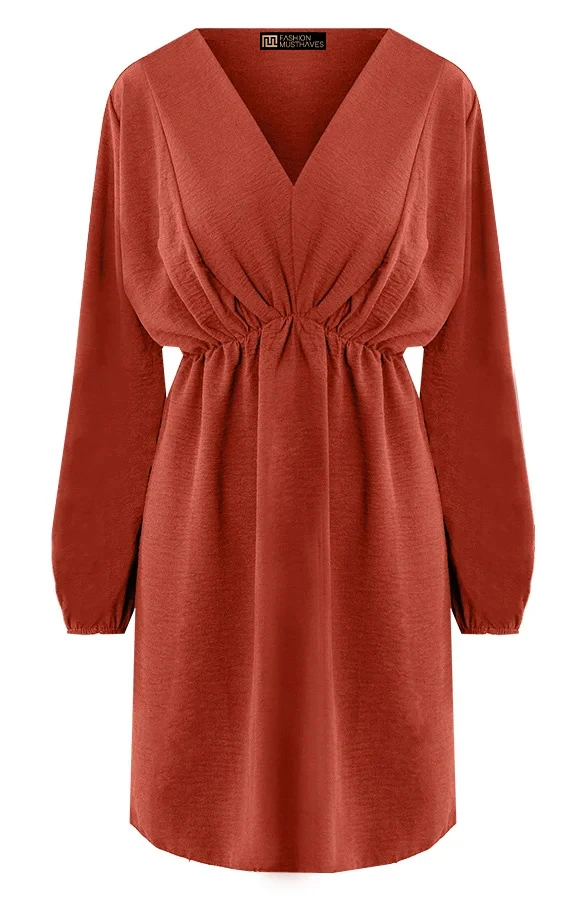 Product: Hoe leuk is dit jurkje in deze trendy kleur?! De v-hals jurk is voorzien van elastiek in de taille.