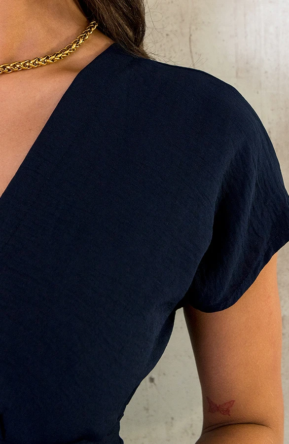 Details: v-hals, korte mouwen, lint om te strikken, knoopsluiting en elastiek Materialen: 5% Elastaan, 95% Polyester