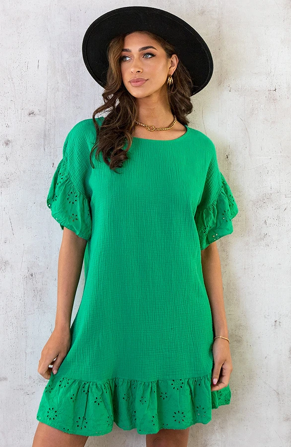 Product: Bright green! Dé trendkleur van dit moment! Dit katoenen jurkje zit heerlijk luchtig en is verkrijgbaar in meerdere kleuren!