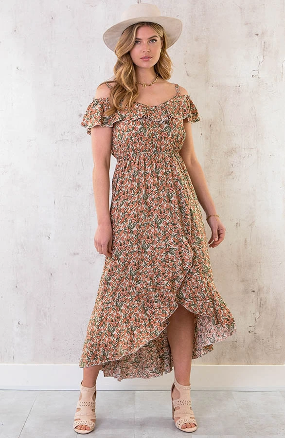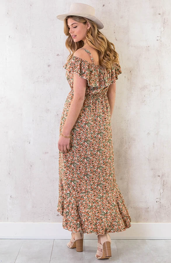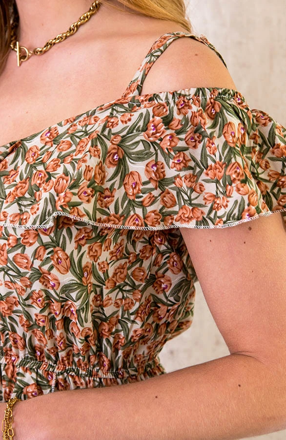 Details: elastieken band, ruches, elastiek, bloemenprint, offshoulder en verstelbare spaghettibandjes Materialen: 65% Viscose, 35% Katoen