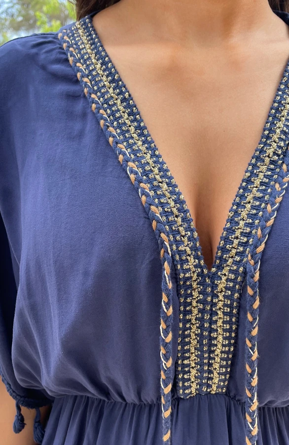 Details: v-hals, korte mouwen, elastiek in de taille, pompons, gevlochten touwtjes en lurex Materiaal: 100% Viscose