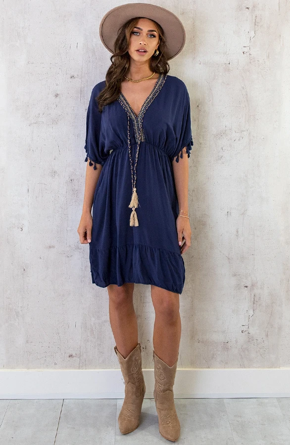 Product: Our fave! Deze marineblauwe jurk is voorzien van prachtige details! Wees er snel bij want deze bestseller is mega gewild!