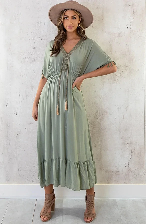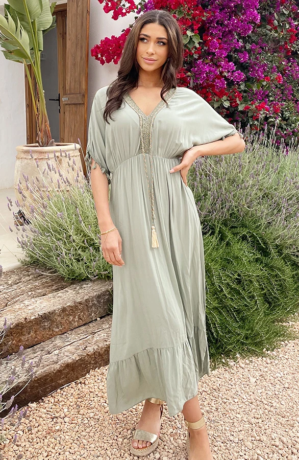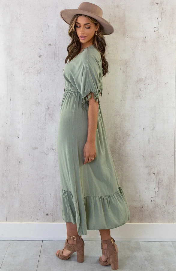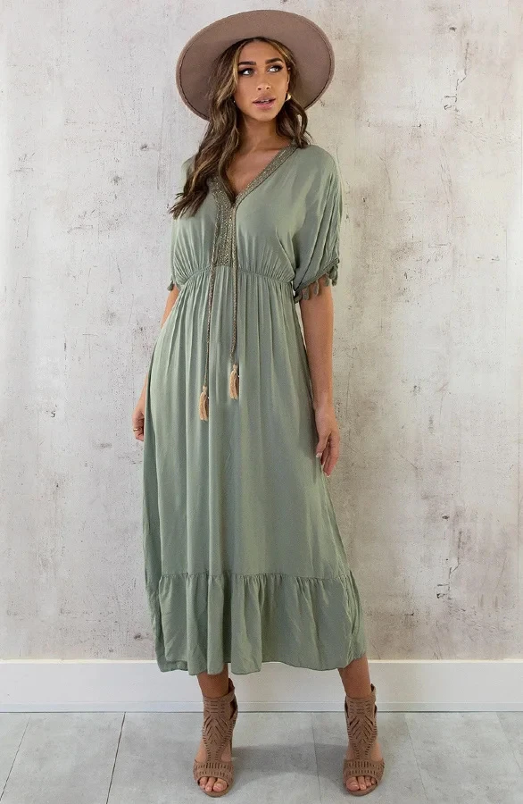 Product: We LOVE army! Deze té leuke maxi dress moet je hebben! Voorzien van gouden details, pompons en gevlochten touwtjes.
