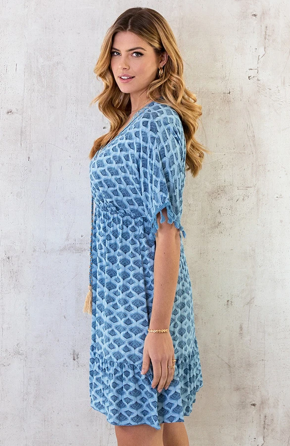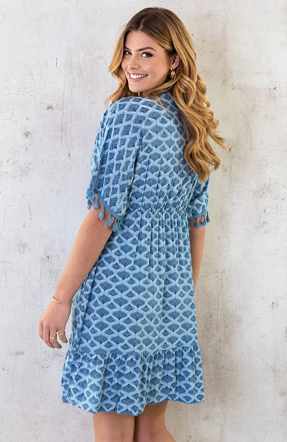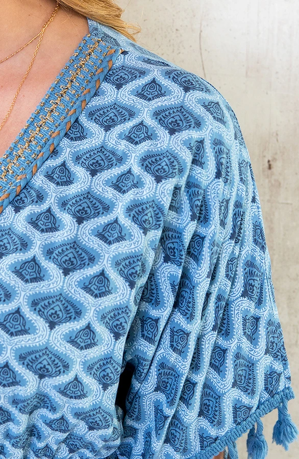 Details: v-hals, korte mouwen, elastiek in de taille, pompons, gevlochten touwtjes en lurex Materiaal: 100% Viscose