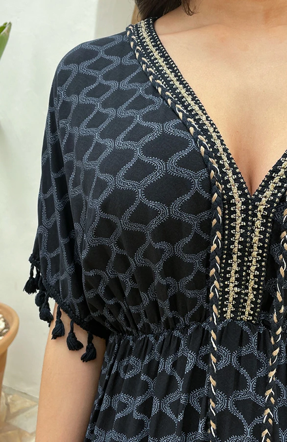 Details: v-hals, korte mouwen, elastiek in de taille, pompons, gevlochten touwtjes en lurex Materiaal: 100% Viscose