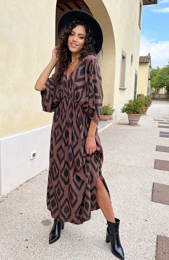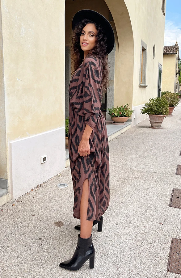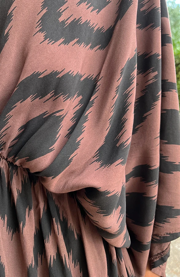 Details: split, v-hals, korte mouwen, vleermuismouwen en elastiek in de taille Materiaal: 100% Viscose