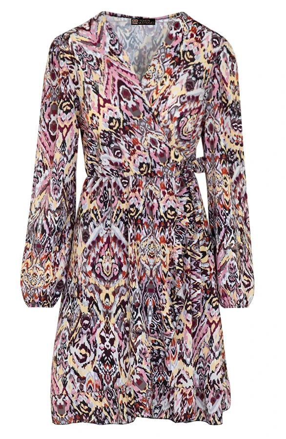 Product: Wauw! Hoe gaaf is deze overslag jurk met paisley print?! Dit jurkje is voorzien van ruches en een bijpassend lint om te strikken.