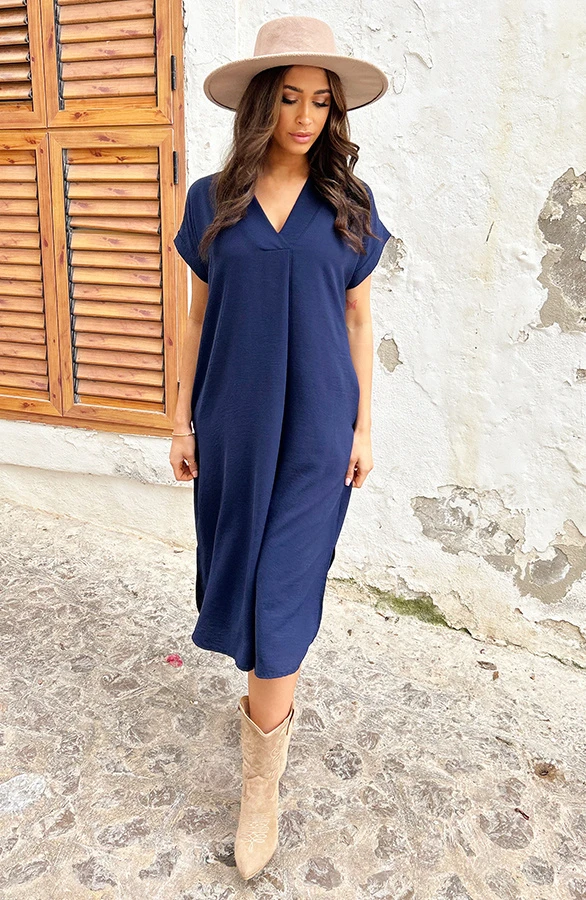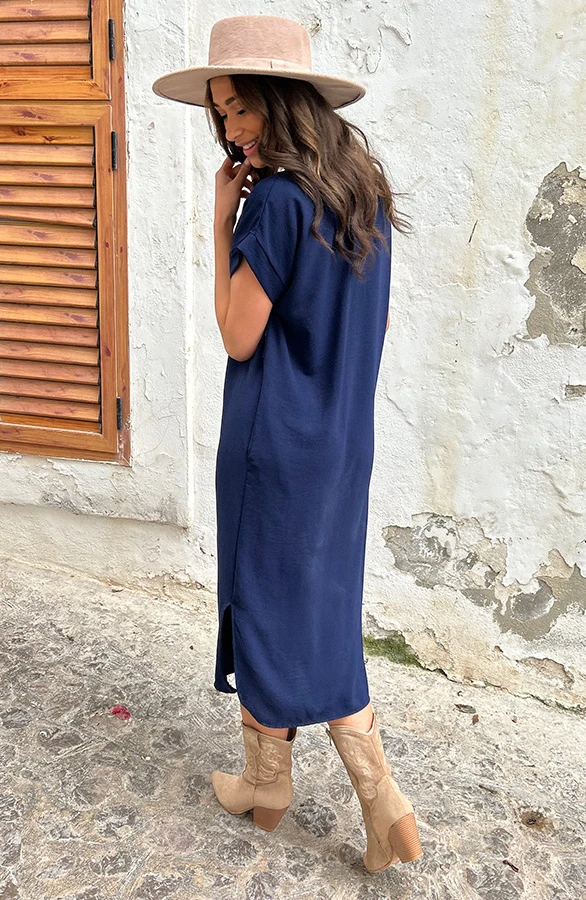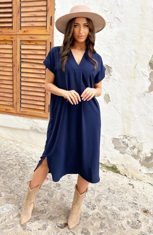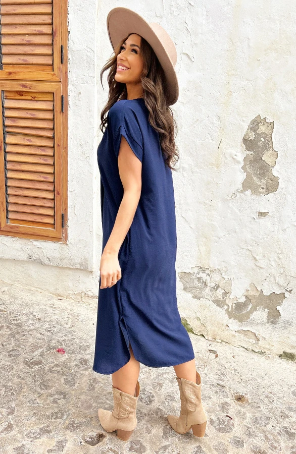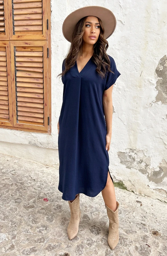 Product: Musthave alert! Deze marineblauwe jurk is een aanwinst voor jouw garderobe! Voorzien van steekzakken en perfect voor meerdere gelegenheden!