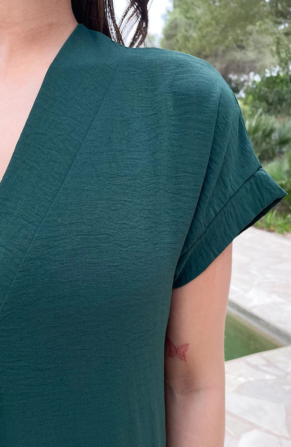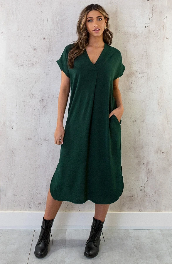 Product: Deze smaragdgroene jurk behoort tot onze bestsellers! De Palermo Jurk is voorzien van een v-hals, steekzakken en splitjes aan de zijkant.