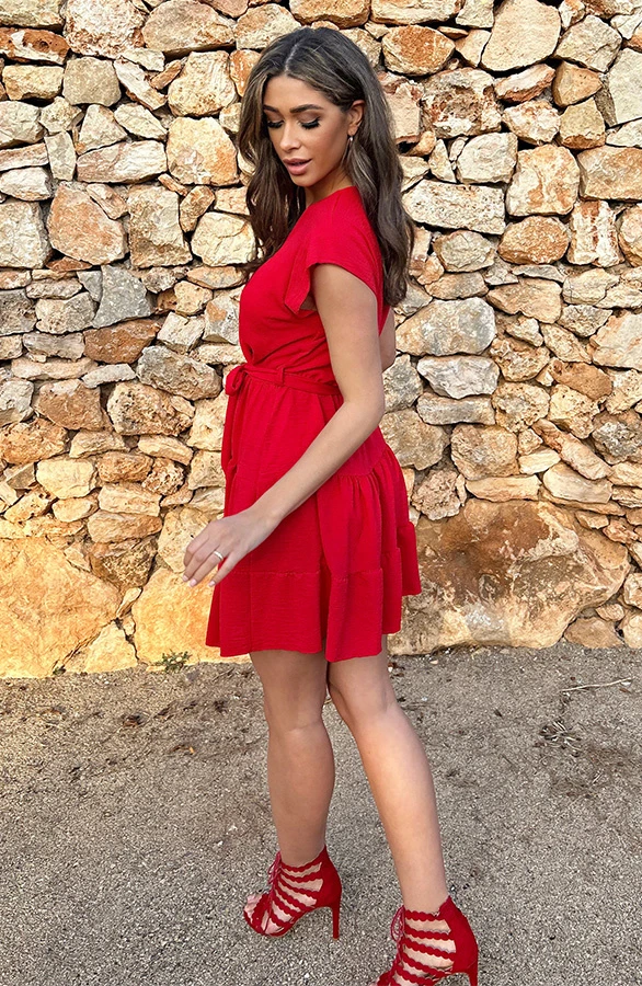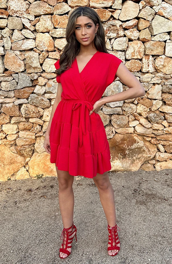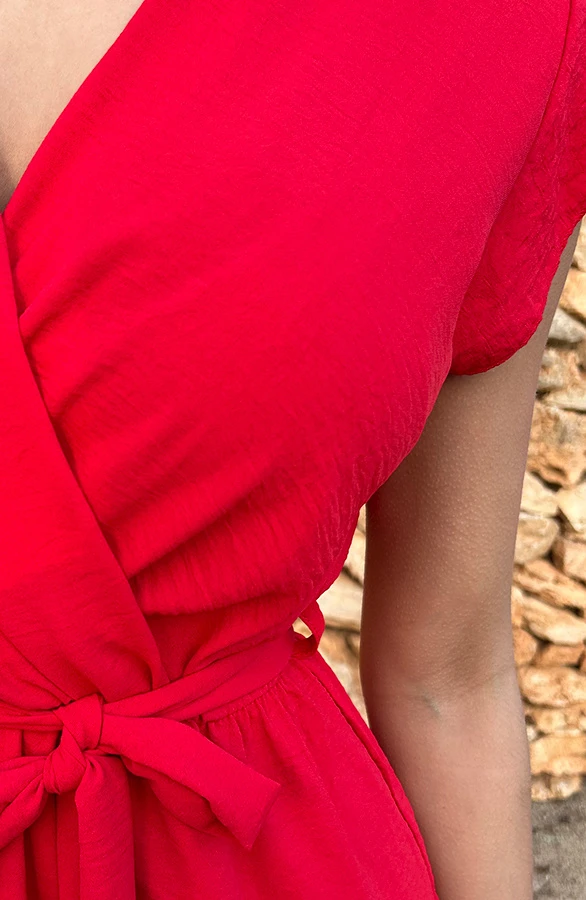 Product: Lady in red! Dit rode v-hals jurkje is een aanwinst voor jouw garderobe! Het a-lijn jurkje is voorzien van elastiek in de taille en een lint om te strikken.