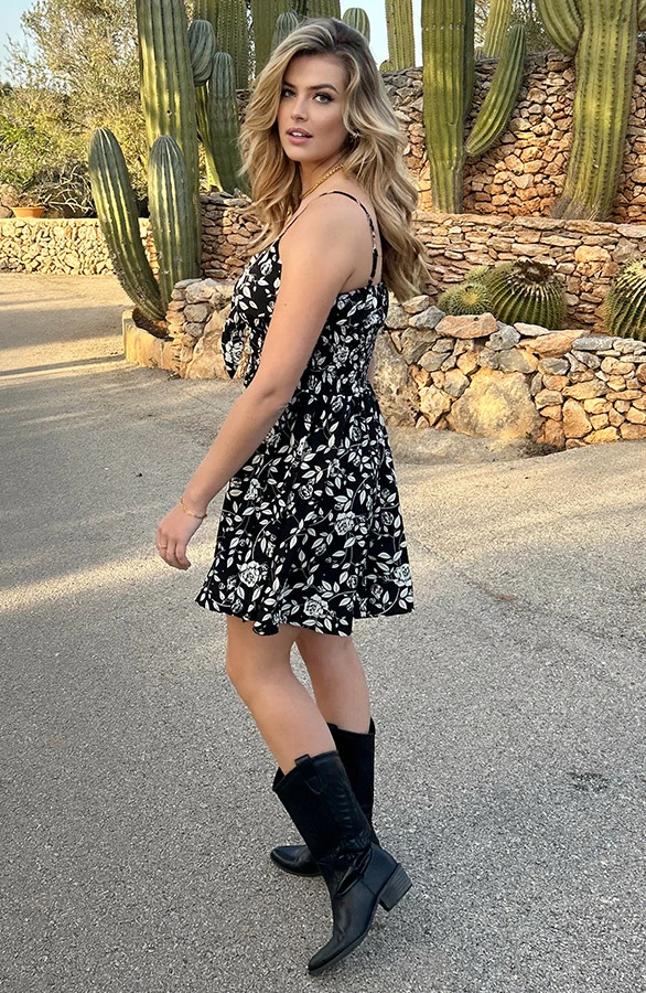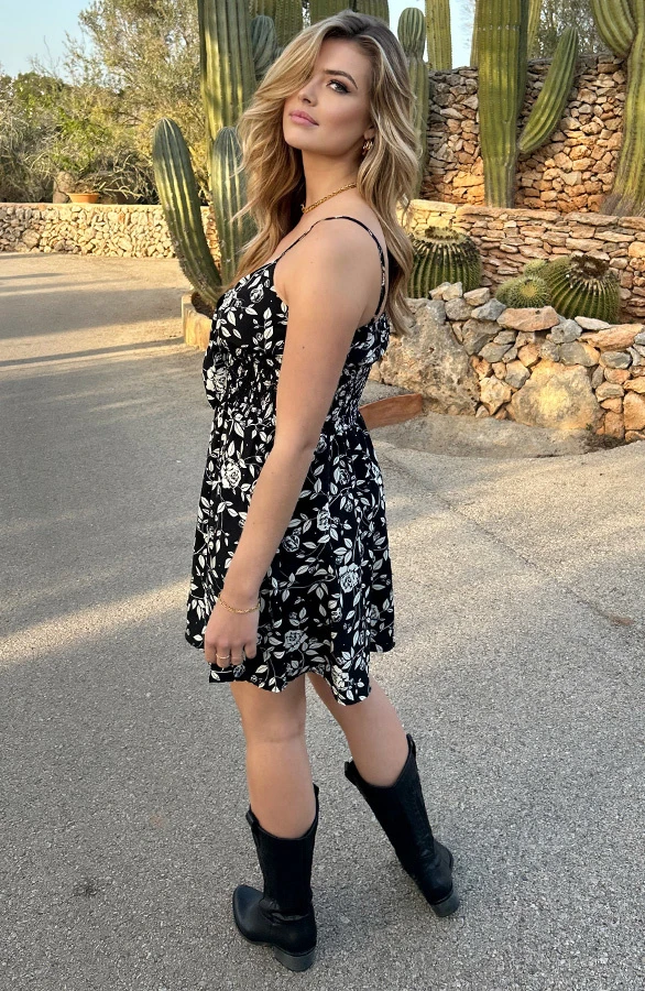 Details: elastieken band, v-hals, bloemenprint, elastiek in de taille en verstelbare spaghettibandjes Materialen: 65% Viscose, 35% Katoen
