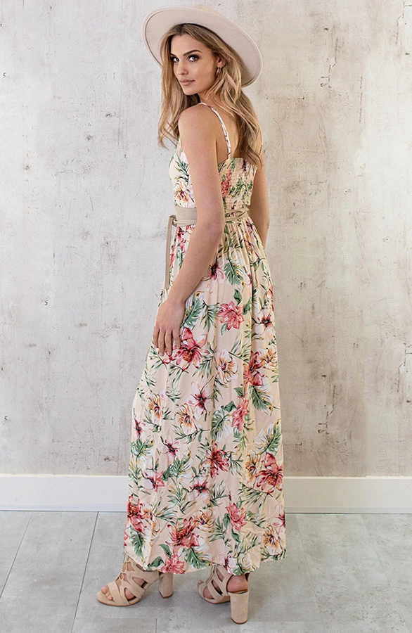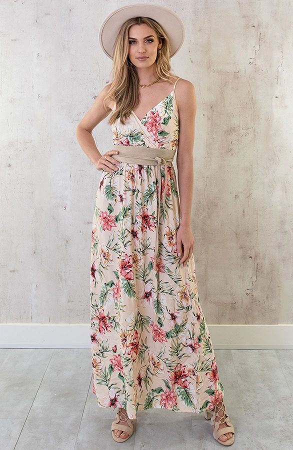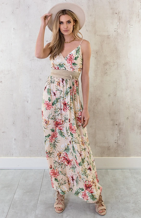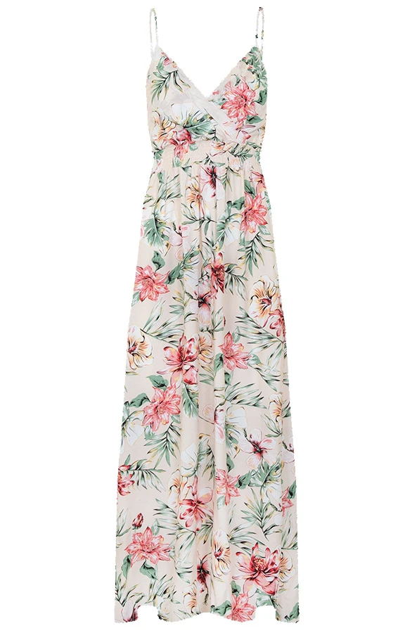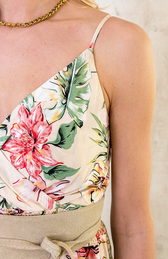 Details: v-hals, bloemenprint, elastiek in de taille en verstelbare spaghettibandjes Materialen: 65% Viscose, 35% Katoen
