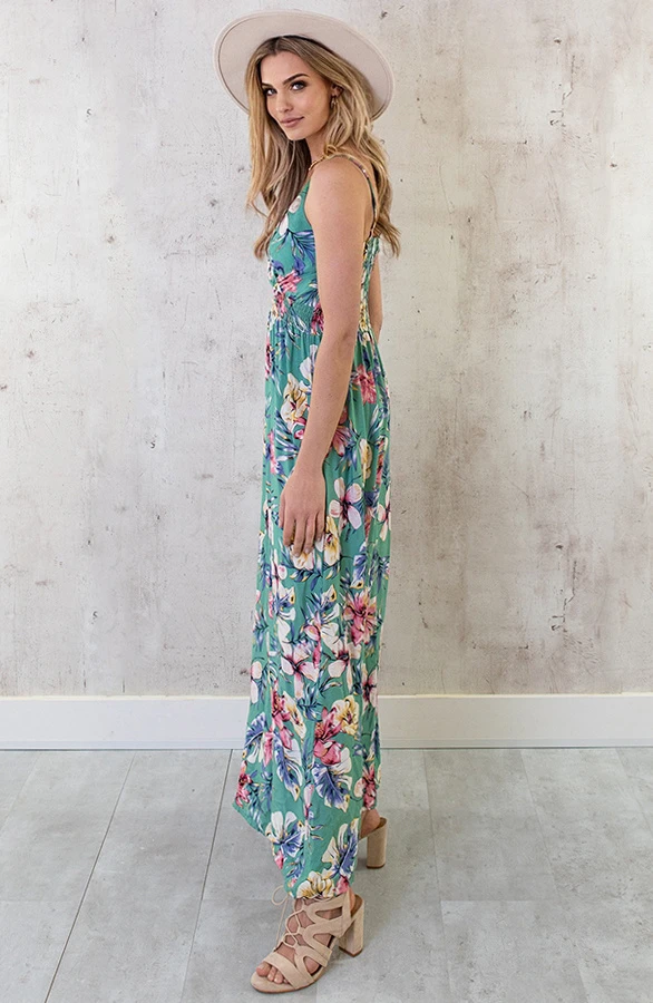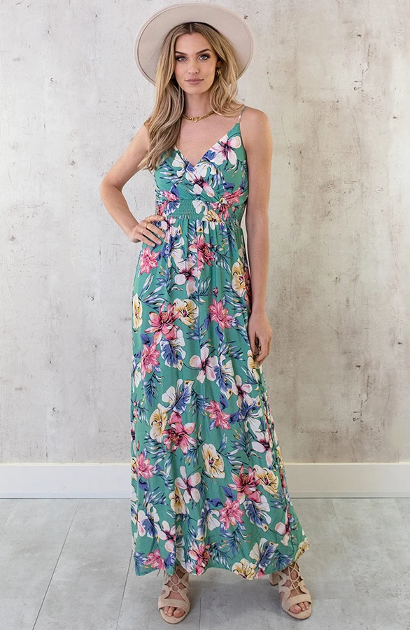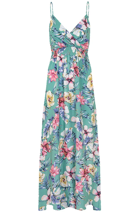 Details: v-hals, bloemenprint, elastiek in de taille en verstelbare spaghettibandjes Materialen: 65% Viscose, 35% Katoen