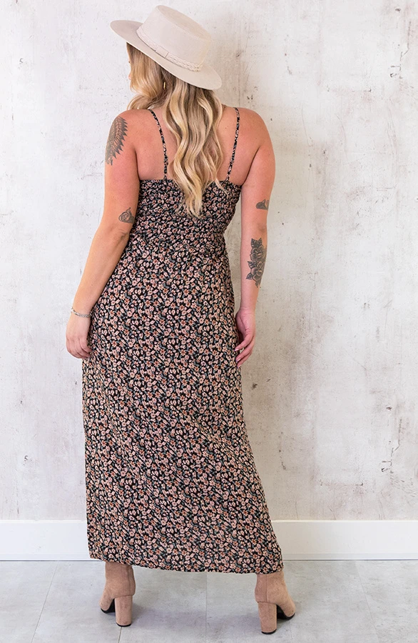 Product: O-MY! Hoe geweldig is deze maxi jurk met all-over bloemenprint?! De jurk is voorzien van een v-hals, verstelbare spaghettibandjes en een elastieken band op de rug.