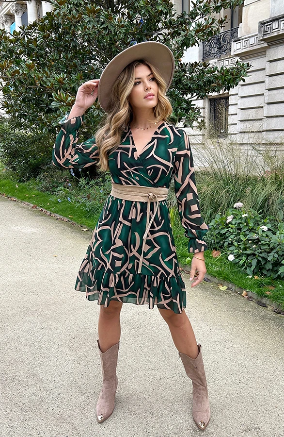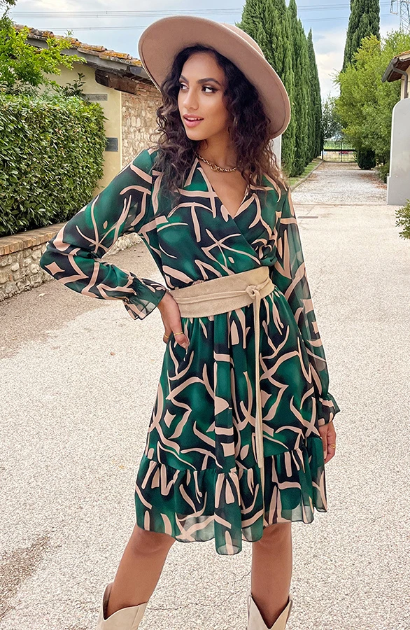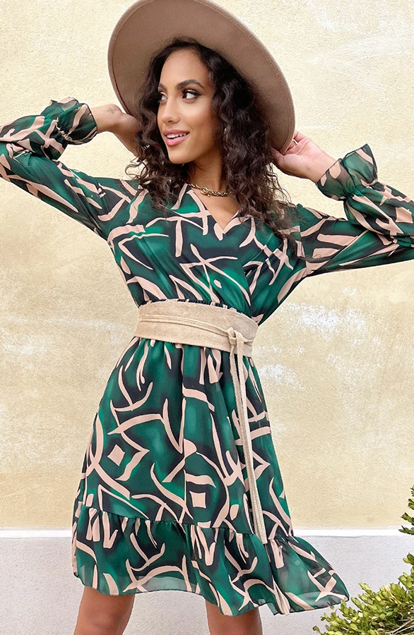 Product: Steel de show met deze geweldige jurk! De jurk met print is voorzien van lange mouwen, ruches en een onderjurk.